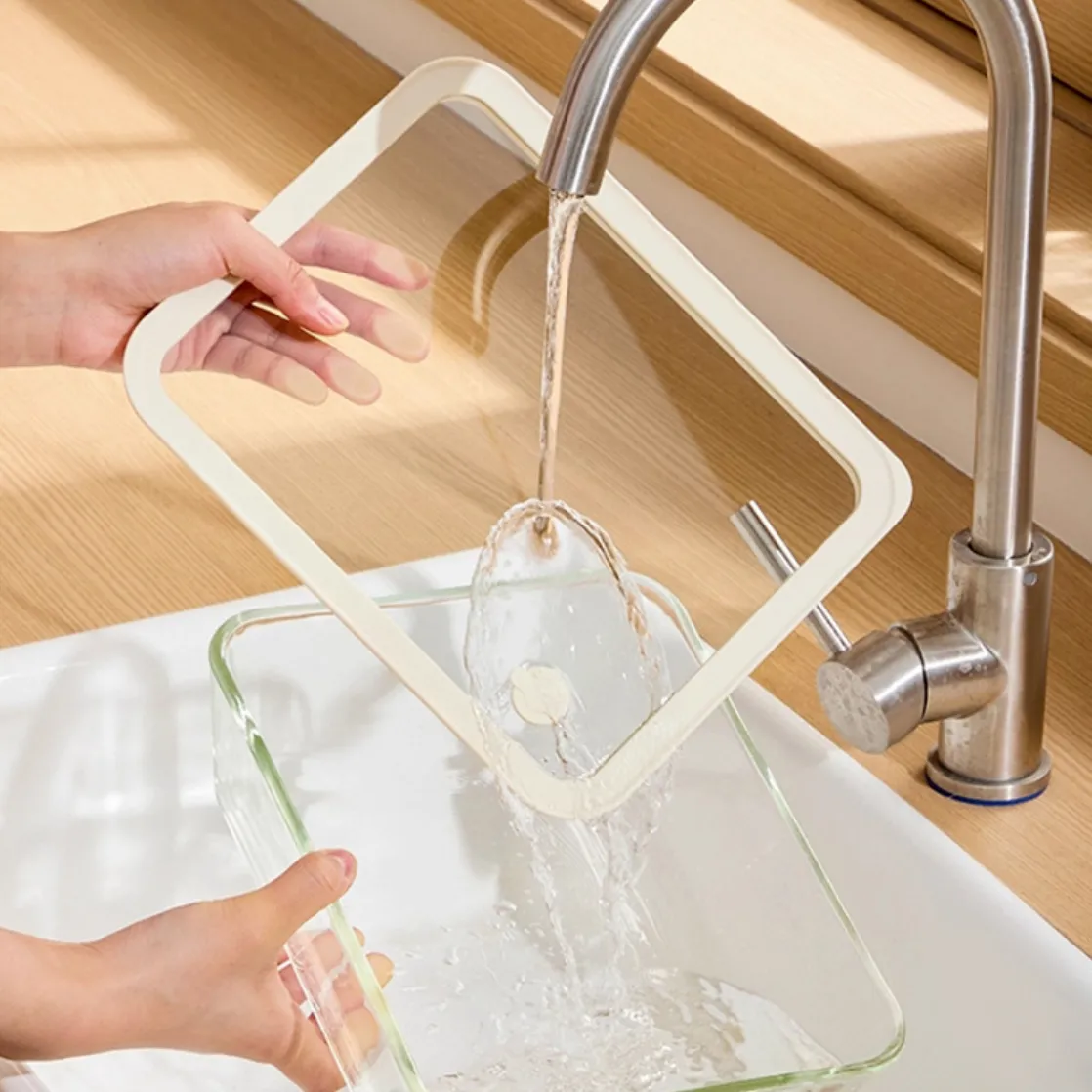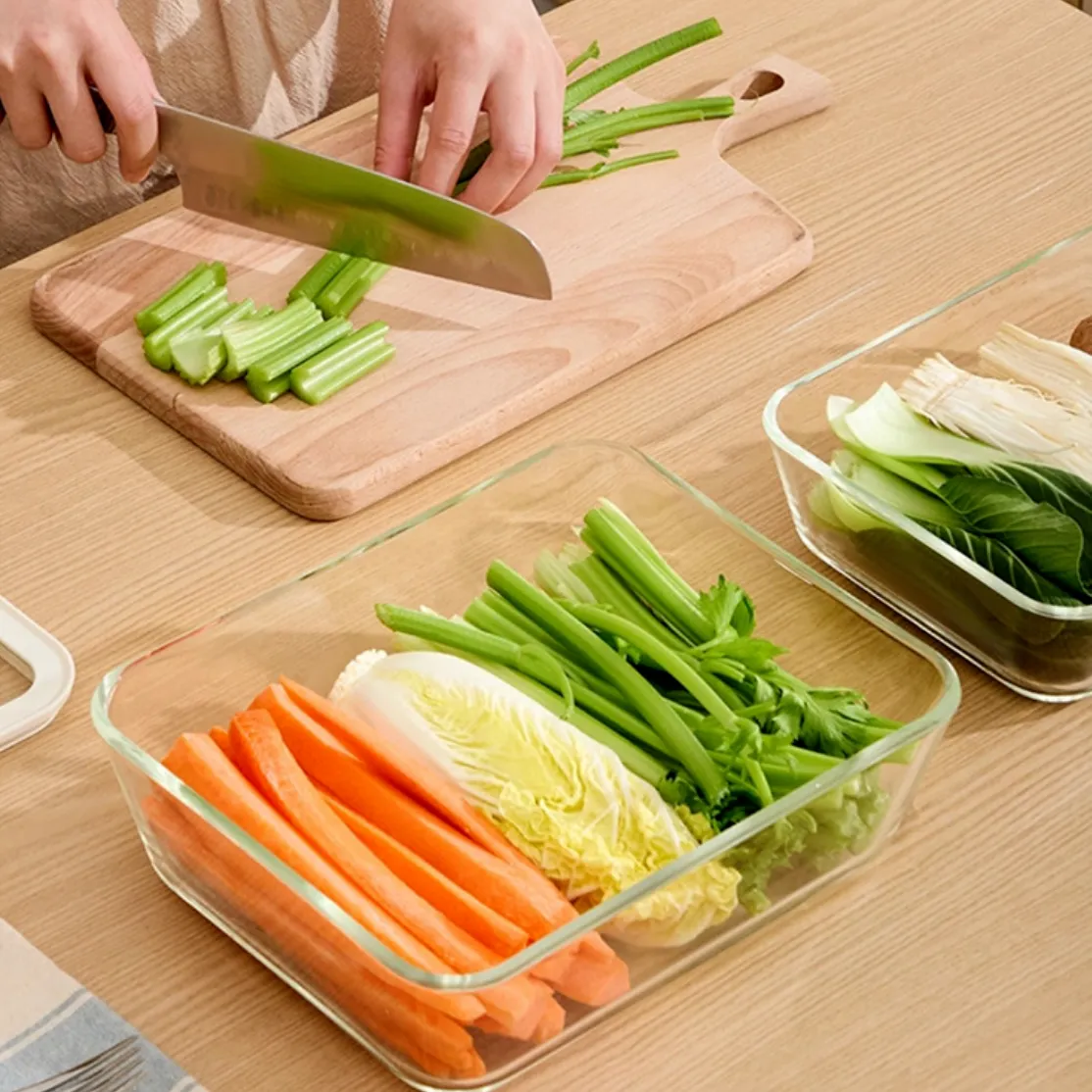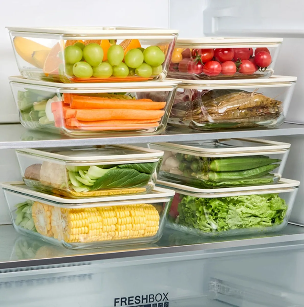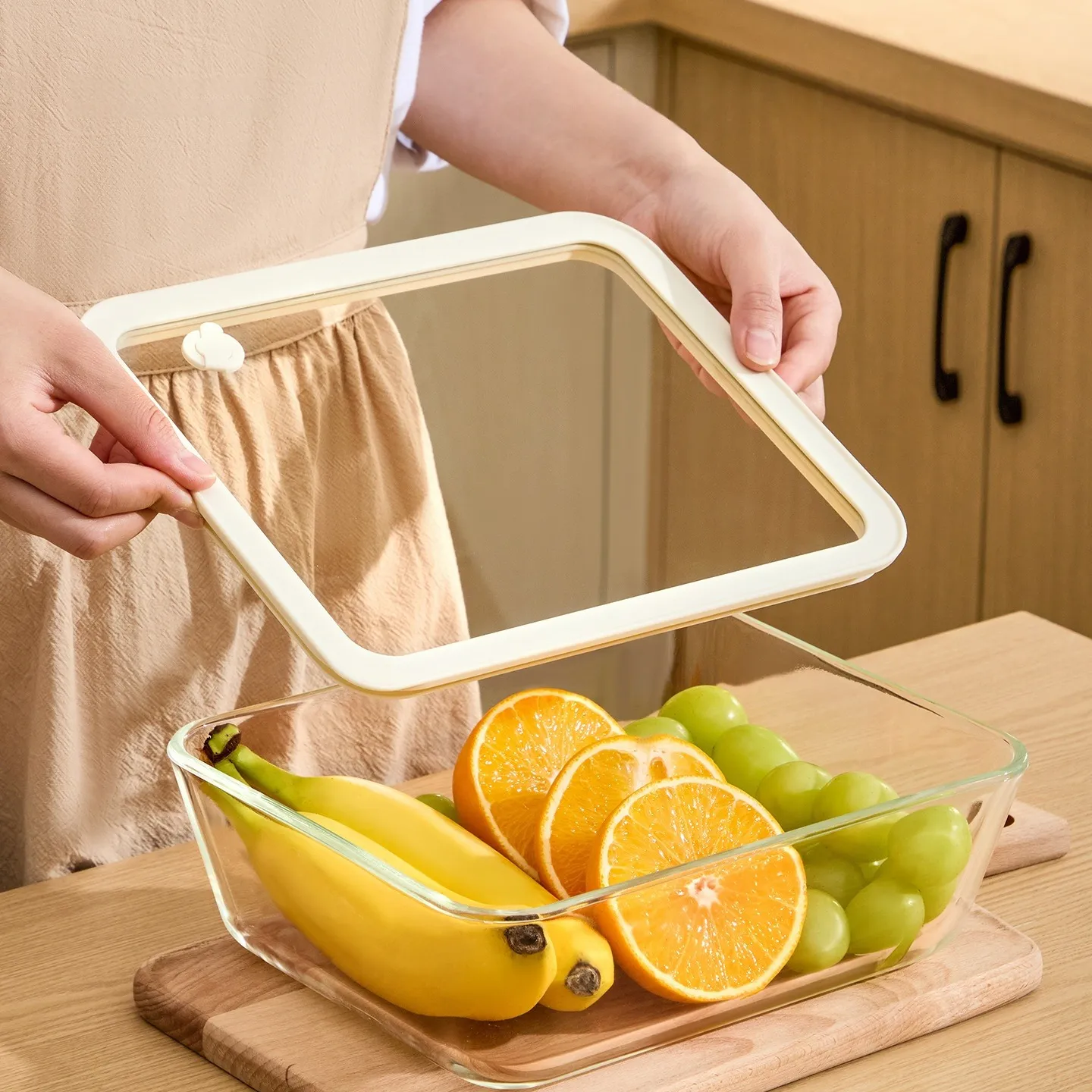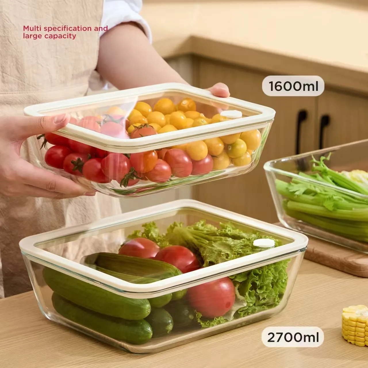 This is a food storage container made of high borosilicate glass. The lid is made of tempered glass, food-grade silicone ring and air vent valve.